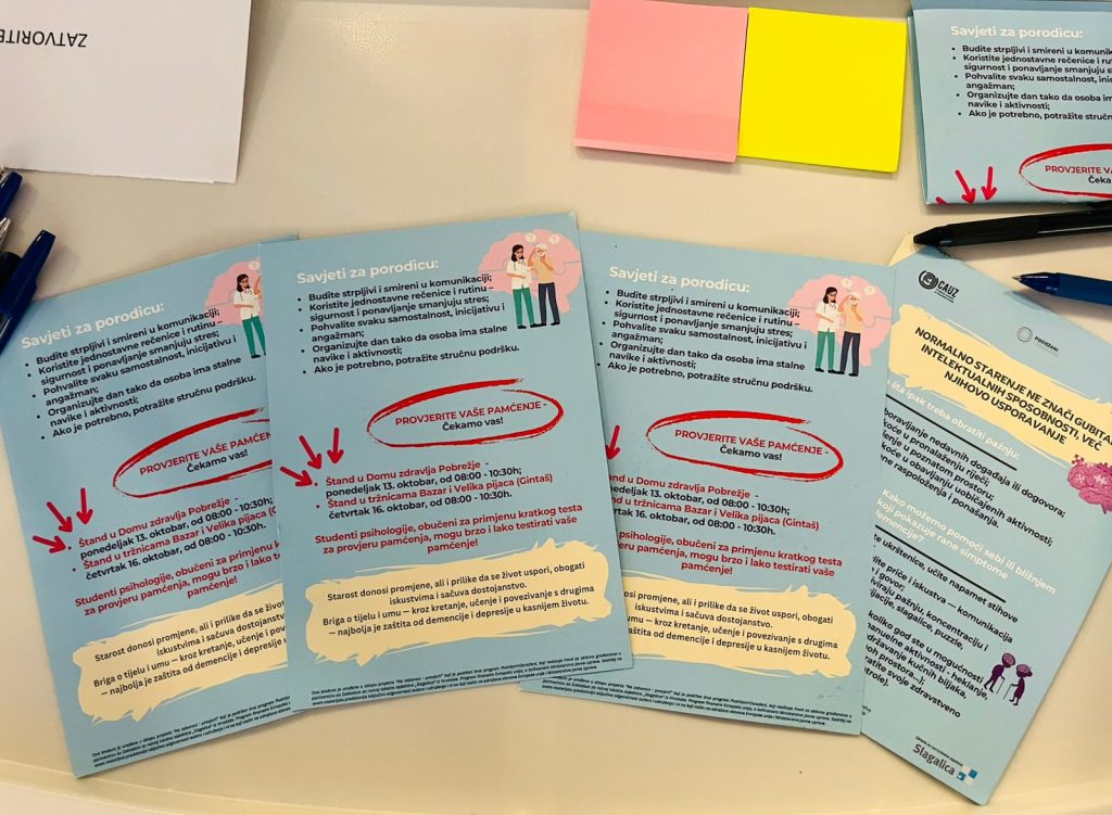 Dana 16.10.2025. godine na našim objektima TC Pobrežje i TC Bazar održana je javna akcija pod nazivom: ,,Ne zaboravi-provjeri,,. Naime, studenti i studentkinje psihologije u okviru Festivala mentalnog zdravlja pružali su osnovne informacije o ranim znacima demencije, razgovarali sa zainteresovanim sugrađanima, te nudili brzi kognitivni test-besplatno i bez zakazivanja. Akcija je imala za cilj podizanje svijesti o značaju rane detekcije kognitivnih poteškoća i očuvanju mentalnog zdravlja, posebno kod starije populacije. Posjetioci su imali priliku da sa stručnim timom porazgovaraju o načinima očuvanja pamćenja, važnosti redovnih provjera i zdravim životnim navikama koje doprinose boljoj moždanoj funkciji. Uz poruku ,,Briga o pamćenju počinje razgovorom,, mi ćemo nastaviti da podržavamo akcije usmjerene na unapređenje zdravlja i promociju preventivnih aktivnosti u zajednici.